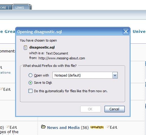Another issue: If I try to run /links/admin/diagnostic.php (as suggested in a thread here), I get page not found errors unless I set the permissions at 755. Then I get the notice with the oddly named SQL script "save as" dialog as shown in the second picture. I have reset the permissions to 644 on it.