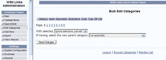 In Admin > Common Tasks > Edit Categories, none of the categories show up ... I have just the header and pagination, as shown. Permissions on all the template files are manually set to 655 (see note below).